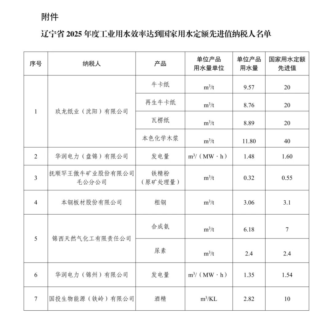 辽宁省2025年度工业用水效率达到国家用水定额先进值纳税人名单公示