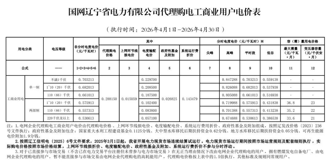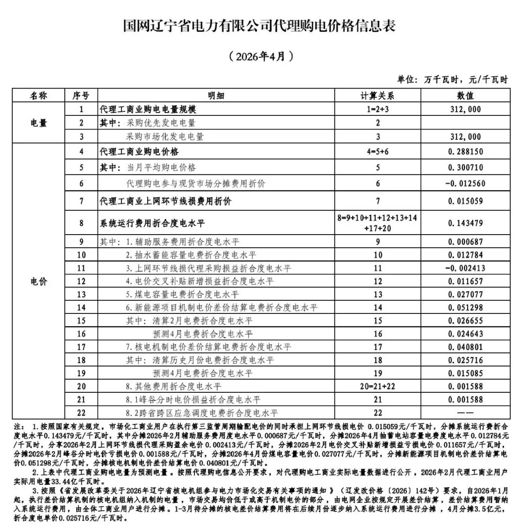 国网辽宁省电力公司 | 发布代理购电价格信息(2026年4月)